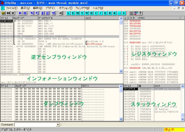 話が脱線した気もするので戻します。解析→再スタート(もしくはCtrl+F2)を選んでもう一度読み込みましょう。F8でステップ実行しながらレジスタの挙動を見てください。movの使い方が大体分かるかと思います。