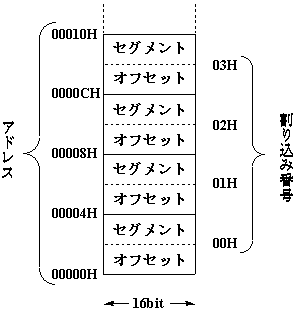 そしてその割り込み番号から実際の処理に移行するには「割り込みベクター」と呼ばれるメモリーを参照してそこにジャンプする。80186以下のCPUや80286以上のリアルモードでは、 00000h〜00400hに割り込みベクターがセットされている。CPUの決まりであり、OSの決まりではない。したがってMS-DOS、N88-BASIC、その他のOS(Windowsなんかはプロテクトモードなので、違う)でも同じ領域にセットされる。